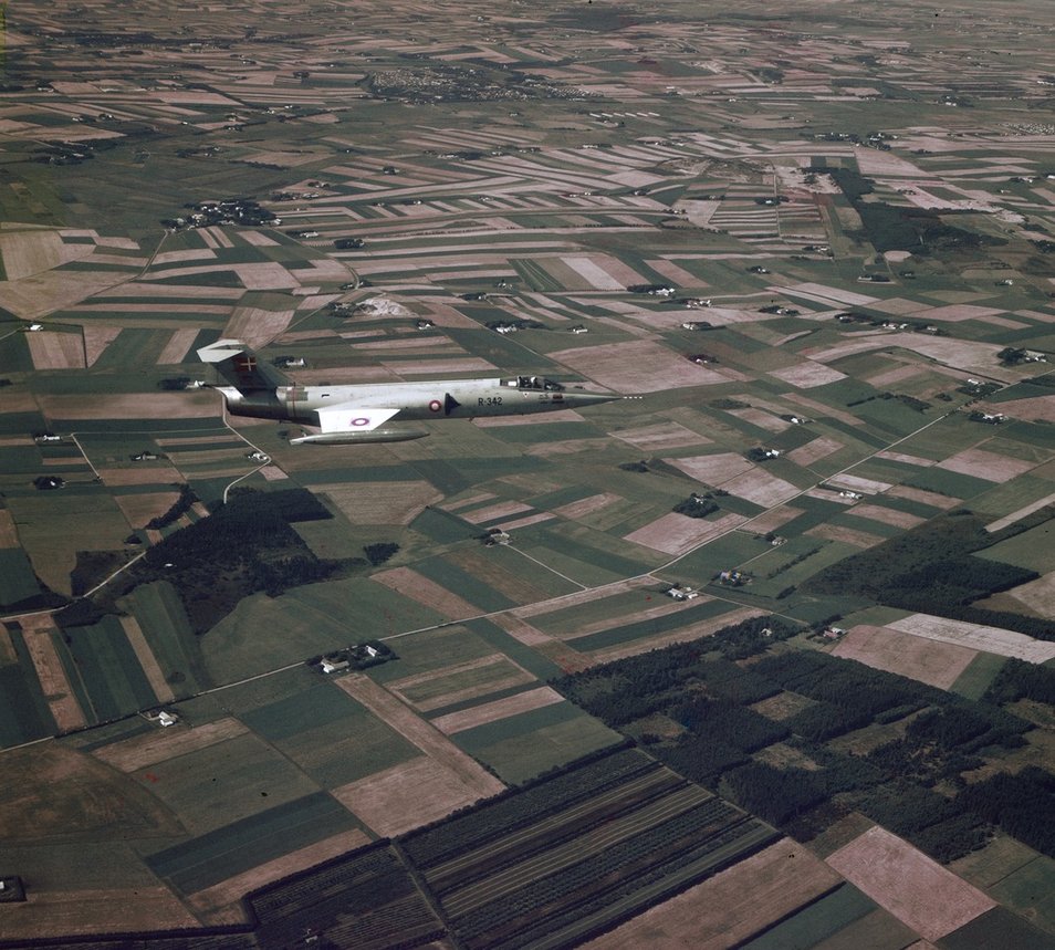 F-104 R-342 ver Bjørnsholm Bugt. Lige over flyet ligger Rønbjerg Huse.